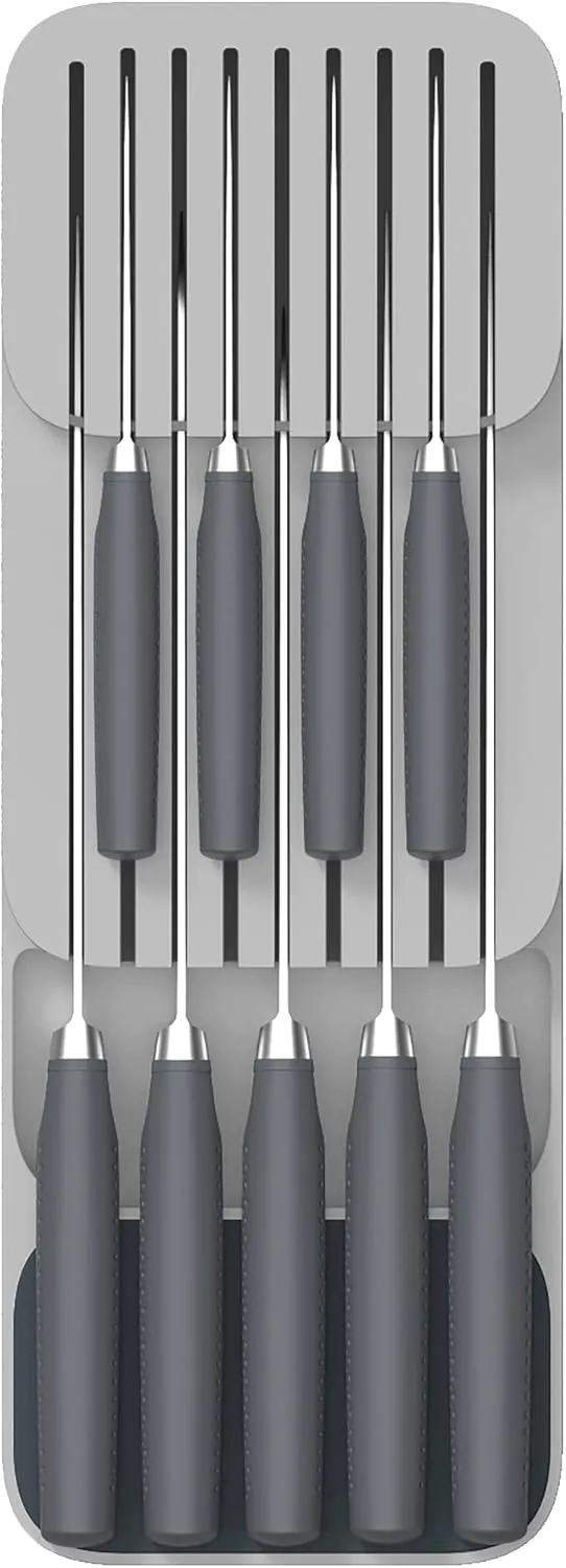 • Non-slip knife storage: Features a sturdy base and textured feet to prevent movement inside your kitchen drawer organizer.