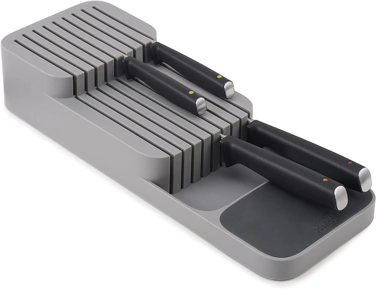 • Joseph Joseph knife tray: A two tier knife block design maximizes vertical space and separates small from large blades.