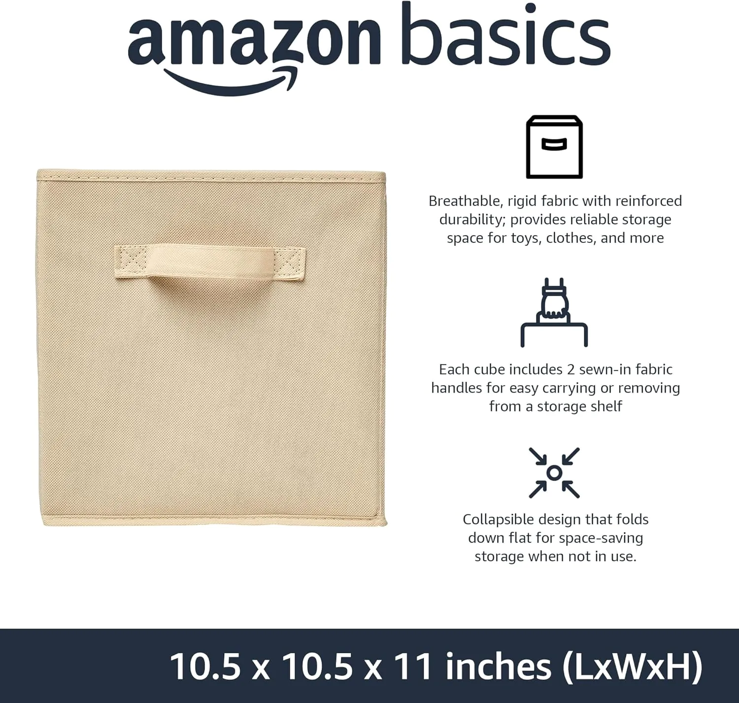 The Amazon Basics Collapsible Fabric Storage Cubes Organizer with Handles (Pack of 6) offers a practical and stylish solution for keeping your space clutter-free. Each lightweight yet sturdy cube supports up to 5 lbs, featuring breathable fabric and convenient sewn-in handles for easy portability. Versatile for use as open bins or drawers in cube organizers, these beige storage cubes suit any room décor. Trust the Amazon Basics brand for affordable, functional storage that helps streamline your home organization.