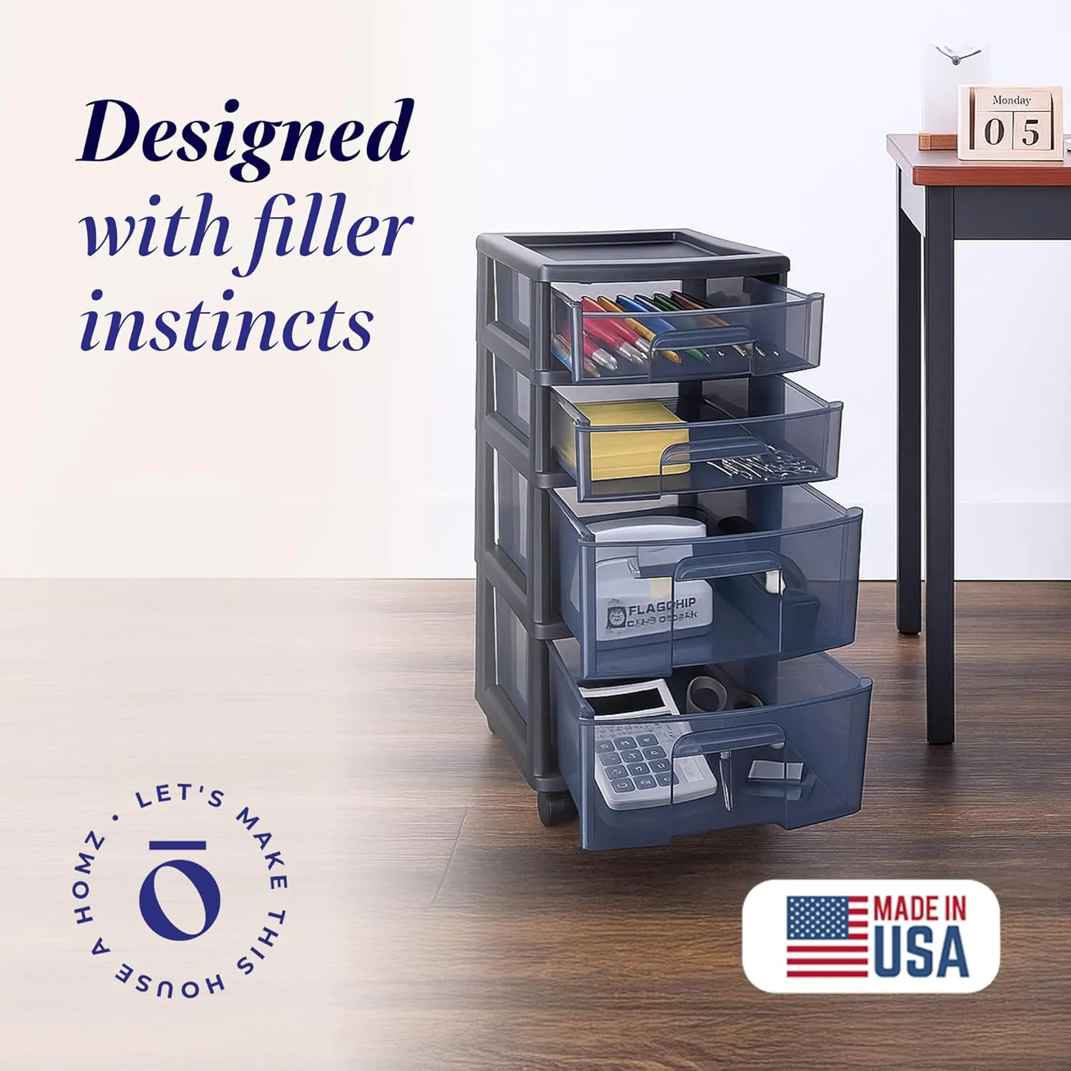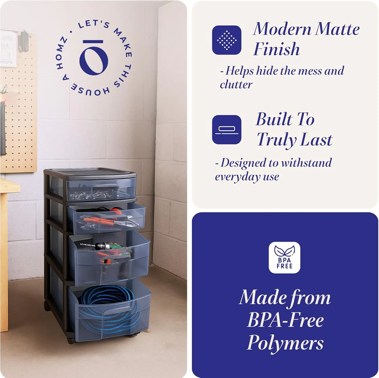 This product is competitively priced against the IRIS 4-Drawer Storage Cart and Sterilite 3-Drawer Unit. The HOMZ model offers superior sustainability due to its use of a high percentage of recycled plastic, and the 360-degree wheels outperform the basic glide found in most drawer towers.